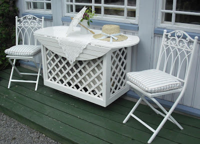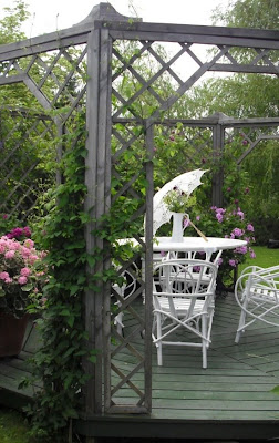 Jeg var litt betatt av alle inntrykk da vi kom på at vi kanskje skulle ta litt bilder, at det blei litt så-som-så med fotograferingen. Men fikk jo tatt noen bilder! :o) Flere steder har hun de mest romantiske og herlige sitteplasser, gjerne med rammer og slyngplanter i høyden. Denne lekre uteplassen har mannen hennes laget, synes den var skjønn!!