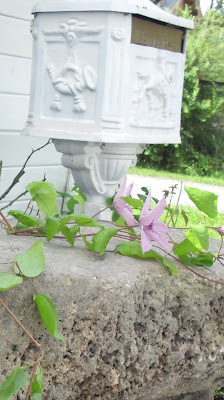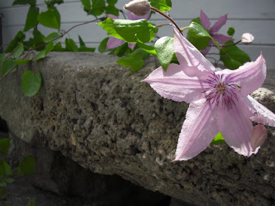 Foreløpig har vi 4 klematis i hagen, hvorav 2 av de har blomstret. (unge planter) Jeg har veldig lyst på mange fler, er så vakkert med planter i høyden!! Denne er definitivt favoritten i hagen nå – Hagley Hybrid. Tror dere forresten ikke vi har fått benk i stein ved siden av postkassa nå?? :o) Da vi kjøpte huset vårt for en liten stund siden, lå det litt stein i en haug bak huset. Regner med at de kommer fra den gang inngangstrappa blei laget. Disse har vært så tunge å flytte på, at de foreløpig har fått ligge..