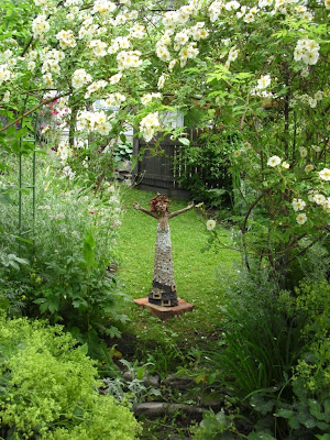 Mange hagerom, buer, ganger.. :o) Hagen er stilig inndelt, slik at man hele tiden oppdager nye planter og annet spennende – inspirerende! Hun har vakker Lykkefund som har slynget seg opp i et digert tre, og hang nedover så det så ut som et digert rose-tre!! Stilig. På bilde over er rosen slynget over en bue, og skaper en nydelig portal inni hagen. Lurer på hvor lenge hun har hatt Lykkefund, tenker på mine to som står i “grotta” bak dammen.. Tenk om de blir sånn etterhvert! Det hadde vært gøy det! :o) …da spørs det om jeg må snekre et klatrestativ istgedenfor pilgrotta som står der nå, slik at de får mer å feste seg i!