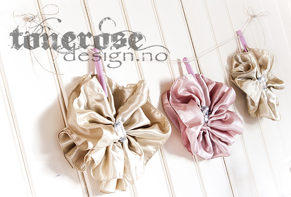 Velkommen til ToneroseDesign ♥ I dag vil jeg tipse littegrann DIY, nemlig “banneret” jeg laget til blondekakebordet her hjemme! Her har jeg brukt stolsløyfer (slike som man knyter rundt stolryggen), og laget rosetter av disse. I midten har jeg plassert (dobbeltsidig teip, hihi) bittelitt bling! Eller, ehm, kanskje ikke bittelitt – hver stein er ganske stor… Elsker litt bling må vite! hihi. Steinene har jeg kjøpt på stoff og stil, planen var egentlig å bruke de til puter, men syntes de passet perfekt til denne bruken. Hver rosett har jeg (bare festet de med teip, enkelt – og sløyfene blir ikke ødelagt) festet med en dolly peg, og deretter knyti fast til litt grov hyssing. Enkelt, og dekorativt! Sløyfer og dollypegs ifra FestFabrikken ♥ (kode ToneroseDesign gir bittelitt rabatt)