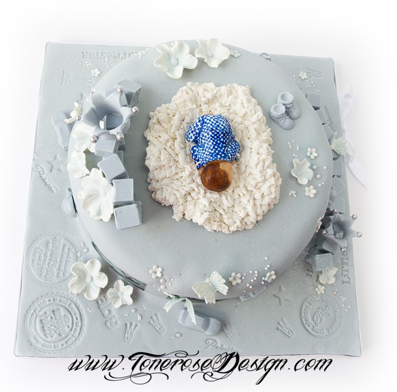 Jeg lager alltid klar pynten på forhånd, dette tar såpass tid at det er godt å ha det klart når selve kaken skal lages/dekoreres. De små bokstavklossene lager jeg ved å bruke en first impression mold, man presser marsipanen nedi formen, og smetter den deretter ut – og fiks ferdig kloss. Perfekt! Til de søte små babyfigurene (tåteflasken etc) har jeg også brukt en silikonform – en slik som denne! Handler du hos Kaketoppen så husk å oppgi kode tonerosedesign – da får du 5% rabatt på hele kjøpet ♥