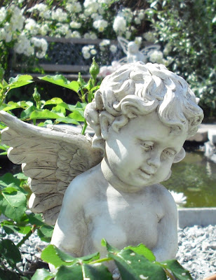 Åee..så mye lekkert i haven din. Jeg er en sto englefan selv, så bare det er jo nydelig å se at andre også liker slik pynt blandt blomstene. Fantastiske roser, og ikke minst er herlig dam, hadde du også 🙂